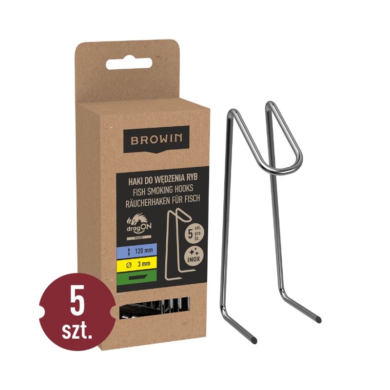 Profesjonalne podwójne haki do wędzenia ryb, wykonane z odpornej na rdzę stali nierdzewnej. Dzięki solidnej konstrukcji zapewniają stabilne i bezpieczne zawieszenie ryb podczas procesu wędzenia, gwarantując równomierne uwędzenie i estetyczny efekt końcowy.