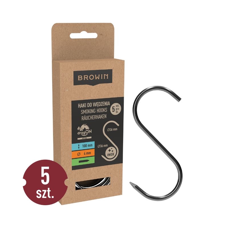 Praktyczne haki wędzarnicze w kształcie litery S o długości 100 mm i średnicy 4 mm, wykonane z wysokiej jakości stali nierdzewnej. Idealne do zawieszania mniejszych kawałków mięsa, takich jak kiełbasy, polędwiczki, żeberka oraz serów podczas wędzenia i suszenia.