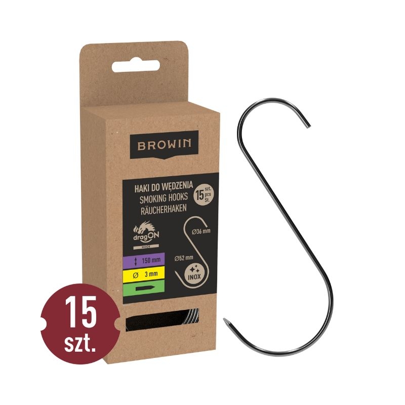 Komplet 15 haków wędzarniczych w kształcie litery S, o długości 150 mm i średnicy 3 mm. Wykonane z wysokiej jakości stali nierdzewnej, są odporne na korozję i wysokie temperatury.