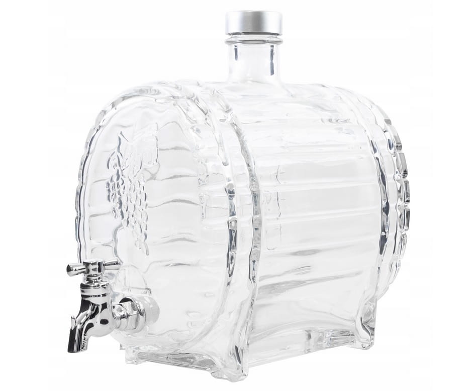Szklana beczułka z kranikiem i zakrętką oraz z pięknym grawerem kiści winogron na szkle. Dzięki niej przyjęcie lub wieczorek w gronie znajomych zapadnie w pamięć na długo!