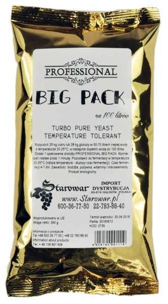 Rozpuścić 25kg cukru lub 28kg glukozy w ciepłej wodzie (50-70 litrów), a następnie dopełnić wodą do 100 litrów. Do nastawu o temp 20-25°C dodajemy jedno opakowanie PROFESSIONAL BIG PACK. Energicznie wymieszać przez minimum 1 minutę. Pozostawić do fermentacji w temp. 22-25°C (niższa temperatura =dłuższy czas fermentacji).