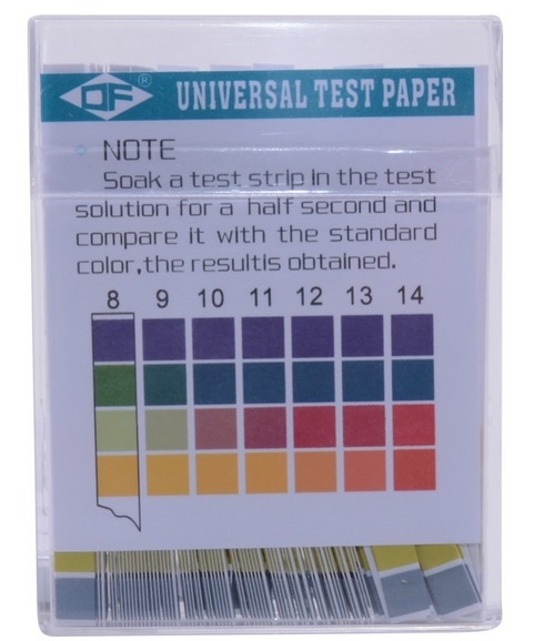 Paski wskażnikowe o zakresie pomiaru 0-14 pH służące do pomiaru pH ze skalą barw umieszczoną obok pola wskżnikowego