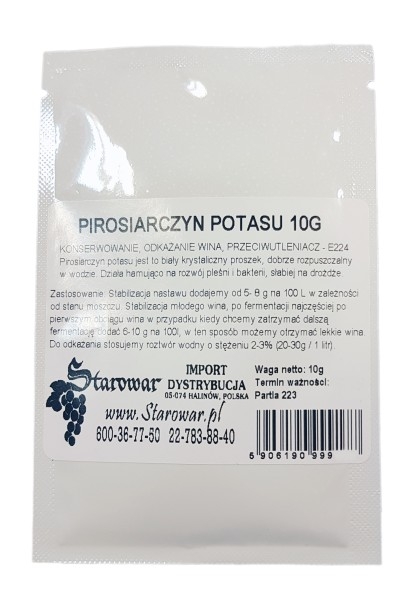 Zapobiega rozwojowi bakterii, grzybów i dzikich drożdży.Sposób użycia:Odpowiednią dawkę pirosiarczanu rozpuścić w niewielkiej ilości moszczu lub wina, następnie dodać do całości i wymieszać: