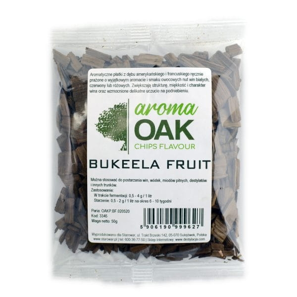 Płatki dębowe AROMA OAK BUKEELA FRUIT wyprodukowane z mieszanki dębu amerykańskiego i francuskiego, sezonowanych 24 miesiące.