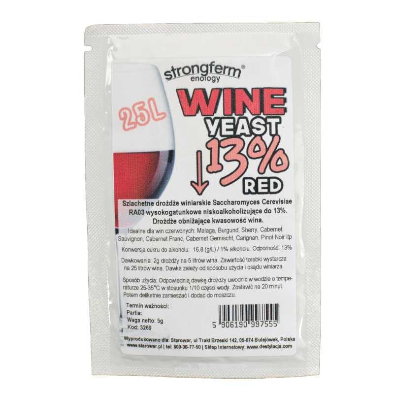 Drożdże winiarskie STRONGFERM WINE YEAST 13% RED przystosowane są do trudnych fermnetacji. Podstawową ich zaletą jest to, że alkoholizują do 13%.