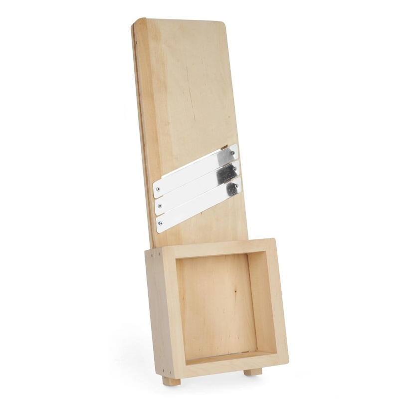 Szatkownica do kapusty i warzyw, wykonana z drewna bukowego, wyposażona w trzy ostrza ze stali nierdzewnej z ruchomą szufladą do szatkowania.