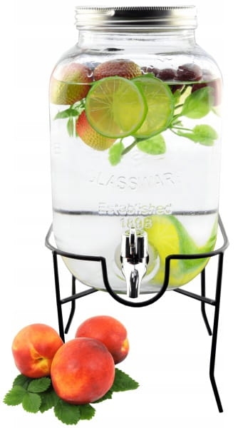 Słój Szklany na Lemoniadę 4L z Kranikiem i Metalową Zakrętką - PEACH + Stojak